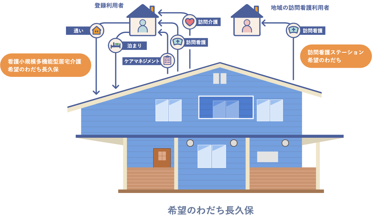「通い」「泊まり」「訪問看護」「訪問介護」の4つのサービスを、顔なじみの職員が一体的に提供するため、安心して利用できます。